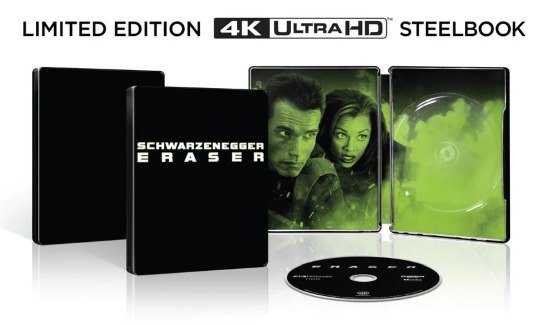 Now then… Chuck Russell’s Eraser (1996) is now starting to appear on various online retail sites for 4K Ultra HD Steelbook pre-order from Warner Bros. Discovery Home Entertainment. The street date is TBA, but I’m told it’s likely to be 6/16 (or thereabouts). Here’s the temp cover art…