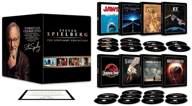 Universal has also just announced a new Amazon-exclusive 8-film Steven Spielberg: The Spotlight Collection on 6/9 that includes Jaws (1975), Close Encounters of the Third Kind (1977), Raiders of the Lost Ark (1981), E.T. the Extra-Terrestrial (1982), Jurassic Park (1993), Schindler’s List (1993), Saving Private Ryan (1998), and War of the Worlds (2005) each in 4K + Blu-ray Steelbook packaging with a library case. It appears that the 20-disc set simply repackages the existing 4K + Blu-ray editions, but we’ll have to see if there’s any exclusive new content. This is now doubt tied into the forthcoming theatrical release of Spielberg’s latest film, Disclosure Day (2026), which hits theaters on 6/12.