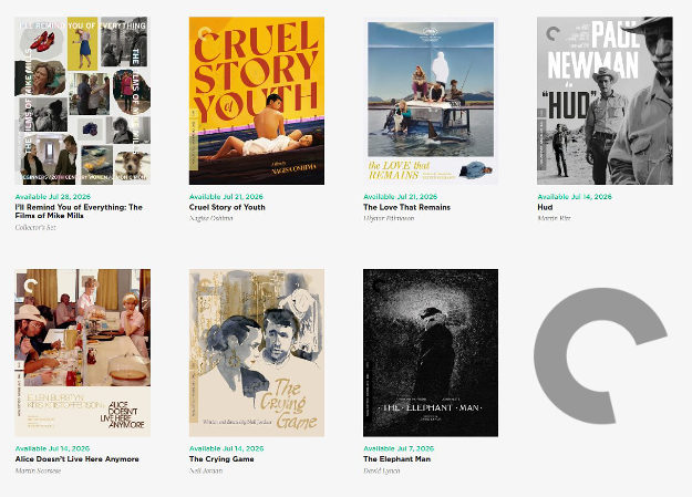 Starting on 7/7, look for David Lynch’s The Elephant Man (1980) (Spine #1051 – 4K UHD + Blu-ray and Blu-ray). On 7/14, you’ll get Neil Jordan’s The Crying Game (1992) (Spine #1320 – 4K UHD + Blu-ray and Blu-ray), Martin Scorsese’s Alice Doesn’t Live Here Anymore (1963) (Spine #1319 – 4K UHD + Blu-ray and Blu-ray), and Martin Ritt’s Hud (1963) (Spine #1319 – 4K UHD + Blu-ray and Blu-ray). On 7/21, look for Hlynur Pálmason’s The Love That Remains (2025) as a new Criterion Premieres title (Blu-ray and DVD), and Nagisa Oshima’s Cruel Story of Youth (1960) (Spine #1321 – 4K UHD + Blu-ray and Blu-ray). And finally, on 7/28 you’ll get I’ll Remind You of Everything: The Films of Mike Mills (Spine #1322 – 4K UHD + Blu-ray and Blu-ray), which includes Beginners (2010), 20th Century Women (2016), and C’mon C’mon (2021).